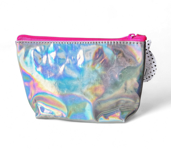 Superleuk Unicorn toilettasje zilvermetallic kleurig met holografische regenboog effecten, bedrukt met leuk unicorn design en voorzien van fuchsia roze rits, leuk voor make-up spulletjes in op te bergen of voor pennen en potloden etc,